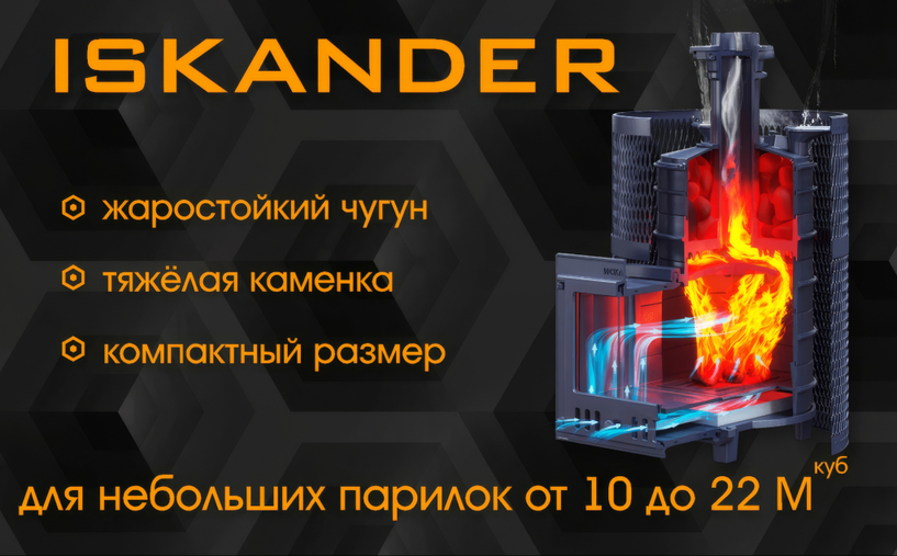 Чугунные печи для бани Гефест, Гроза, Авангард, Искандер и, тем более Гром имеют самый быстрый по времени нагрев парной не зависимо от её объёма. Каменка большой массы, обеспечивает нагрев до 600-700 0С и длительное удержание этого тепла. Получение лёгкого мелкодисперсного пара обеспечивается на очень продолжительное время даже после окончания топки!