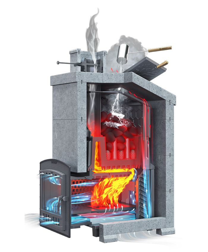 Массивная чугунная каменка. Парообразователь прямого нагрева имеет большой вес и находится в непосредственном контакте с пламенем, благодаря чему быстро нагревается до высоких температур. Кроме того, в каменку можно дополнительно закладывать чугунные заряды и банные камни. Это позволяет увеличить площадь генерации пара и улучшает теплоемкость.